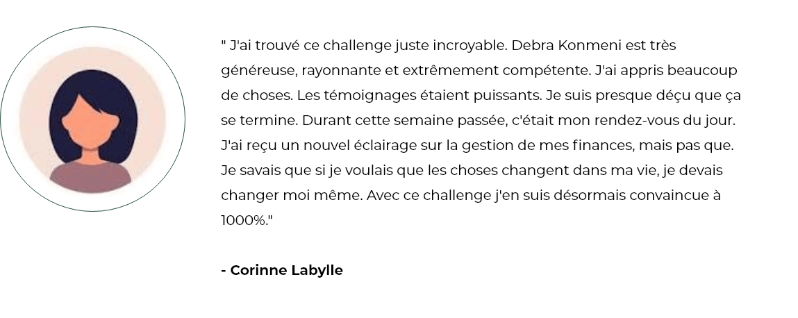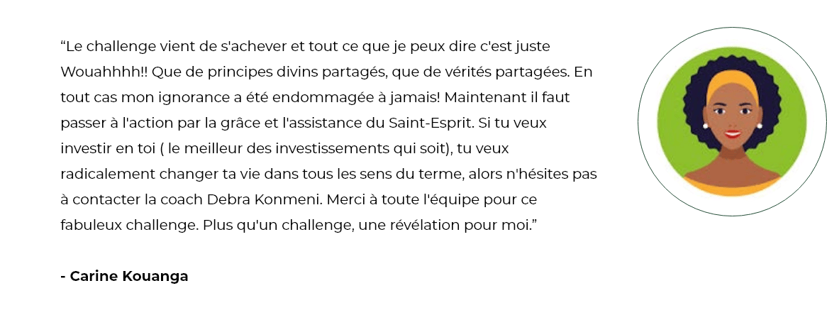 « En entrant dans le programme, je me suis fixé sur les finances. Je n'avais toujours rien compris à mon échec, étant focalisée sur les finances comme 15 ans auparavant. Mais j'ai complètement changé dans tous les domaines qui affectaient ma vie, ce qui m'empêchait de manifester mon potentiel financier. En me concentrant sur ma vie de femme, mon rôle d'épouse, ma santé, mon poids, les finances se sont débloquées. Mon mari et moi avons pu créer une entreprise. Je suis descendue en Afrique, dans mon pays, pour un projet agricole. Nous avons pu déplacer 20 hectares. Notre entreprise ne cesse de prospérer.